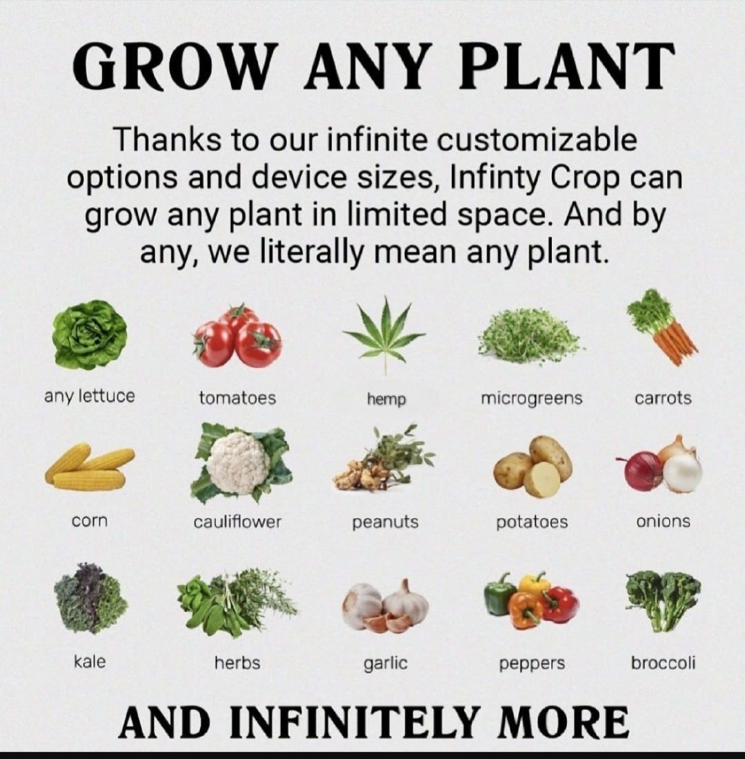 Infinity Crop is a Dream Grow System that organices the plants as they grow, self adjusting and programable abling you to produce the best quality produce with no space, work or knowlege.